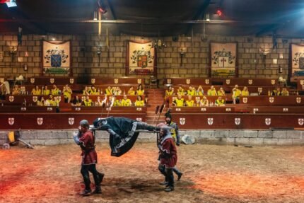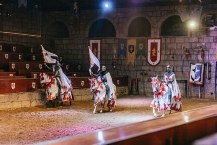Notre château est situé dans le sud de Tenerife et son infrastructure est conçue pour que vous viviez une aventure médiévale dès que vous franchissez ses murs majestueux. Le Castillo San Miguel de Tenerife est une construction de 6 000 mètres carrés, réalisée en pierre de canto, typique des îles Canaries. Dès que vous entrez dans le château, vous vous rendez compte que vous êtes dans un monde médiéval authentique. Le comte Don Rodrigo et sa fille la jeune comtesse vous accueilleront et vous souhaiteront la bienvenue dans leur château, dont l'entrée est décorée d'armures, d'épées, de coffres et d'écrits de l'époque. Les aimables sujets du comte Don Rodrigo vous accompagneront jusqu'à la Sala de los Torneos, où un spectacle de combats, de tournois et de jeux médiévaux se déroulera en présence des comtes. Pendant le tournoi, le banquet sera servi. Le Castillo San Miguel vous propose un menu dont vous pourrez profiter au maximum pendant le banquet, au milieu des joutes. Le menu se compose d'une crème de légumes de saison avec des cubes de fromage, d'un poulet garrot au four dans son jus avec des pommes de terre au four et des tomates assaisonnées, d'un gâteau à la crème glacée avec du sirop de chocolat. Le vin rouge et blanc, l'eau minérale et le jus d'orange sont inclus pendant le dîner. Si vous souhaitez assister au spectacle au premier rang, choisissez l'option VIP. Vous serez également invité à boire un verre de cava avec ce billet.